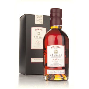 A’Bunadh means “Of the Origin” in Gaelic. It is bottled at cask strength from a vatting (mixture) of Aberlour malts from varying ages (10 to 15 years old). These are all aged in barrels that once held oloroso sherry. Each bottling run (indicated by a batch number on the bottle) will have slightly different alcohol by volume, ranging from 59.3% to 60.9%. Each batch will also vary in flavor, according to the whims of the whiskymaker and the individual characteristics of the source casks. An unsubstantiated rumor holds that a hidden bottle of Aberlour whisky from 1898 was discovered during construction in the still room, that the workmen drank a majority of it, and that A’Bunadh is an attempt by the distillery to re-create the flavor and texture of that historic malt.