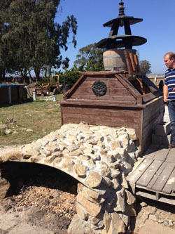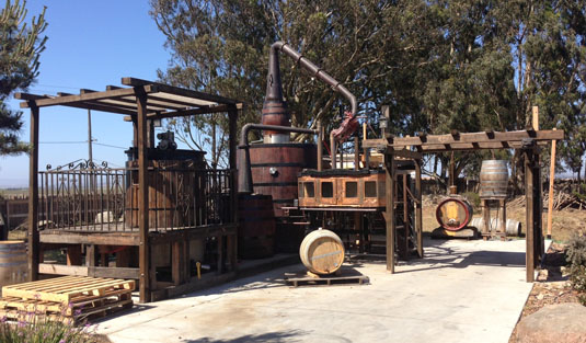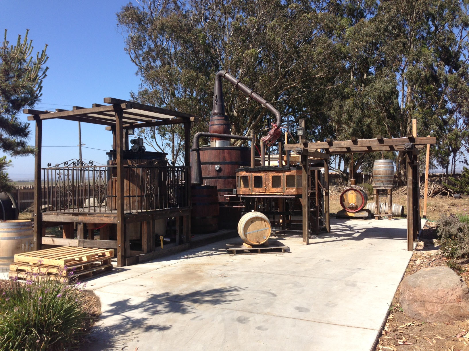 The distillery is located on a ramshackle one-acre property in the wilds of Salinas, California. He is bordered on four sides by farmland and his two gigantic German Shepherds roam the property to “keep out the riff-raff”. The still, an arcane construction, is open to the elements as is his stonework smoker complete with a tongue-in-cheek aluminum “pagoda.”