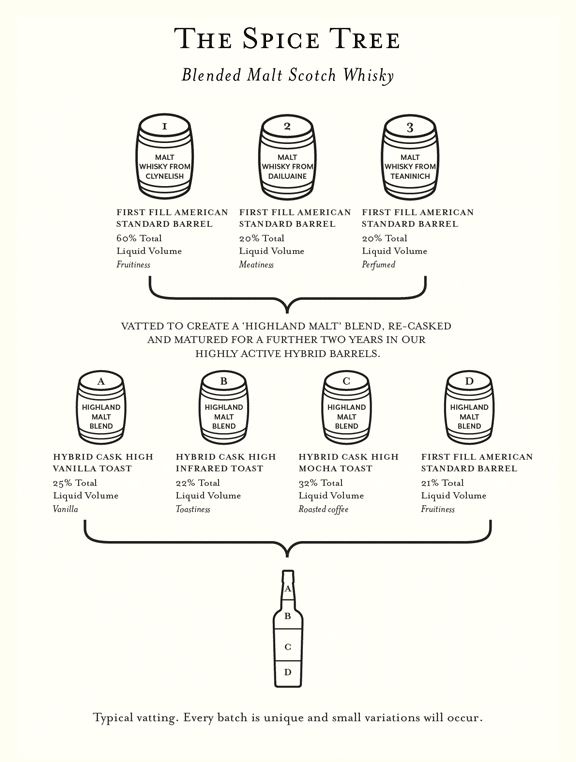 So what is Spice Tree? It’s a blended malt scotch whisky, meaning it is made entirely of malt whisky from more than one Scottish distillery. Rather than try to describe the combination of cask types involved, I will just include Compass Box’s own handy infographic: